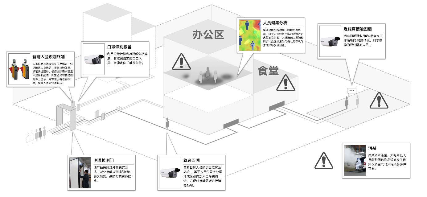 “园区防控解决方案”全称“智慧园区紧急公共事件预警防控终端产品及云服务解决方案”,是从线上健康打卡、非接触AI人体温度检测、人脸识别、口罩识别、物联网终端的数据采集汇聚、“风险人员”活动轨迹和接触回溯、近距离接触预警、人员密集区域热图、重点区域高频消杀、结合新冠肺炎确诊识别知识库,结合智慧园区的门禁管理、视频监控、运动轨迹识别,打造复工后的厂区(园区)全自动、全区域、全天候、全目标覆盖的主动式疫情智慧园区预警防控平台,为园区安全复产复工保驾护航。