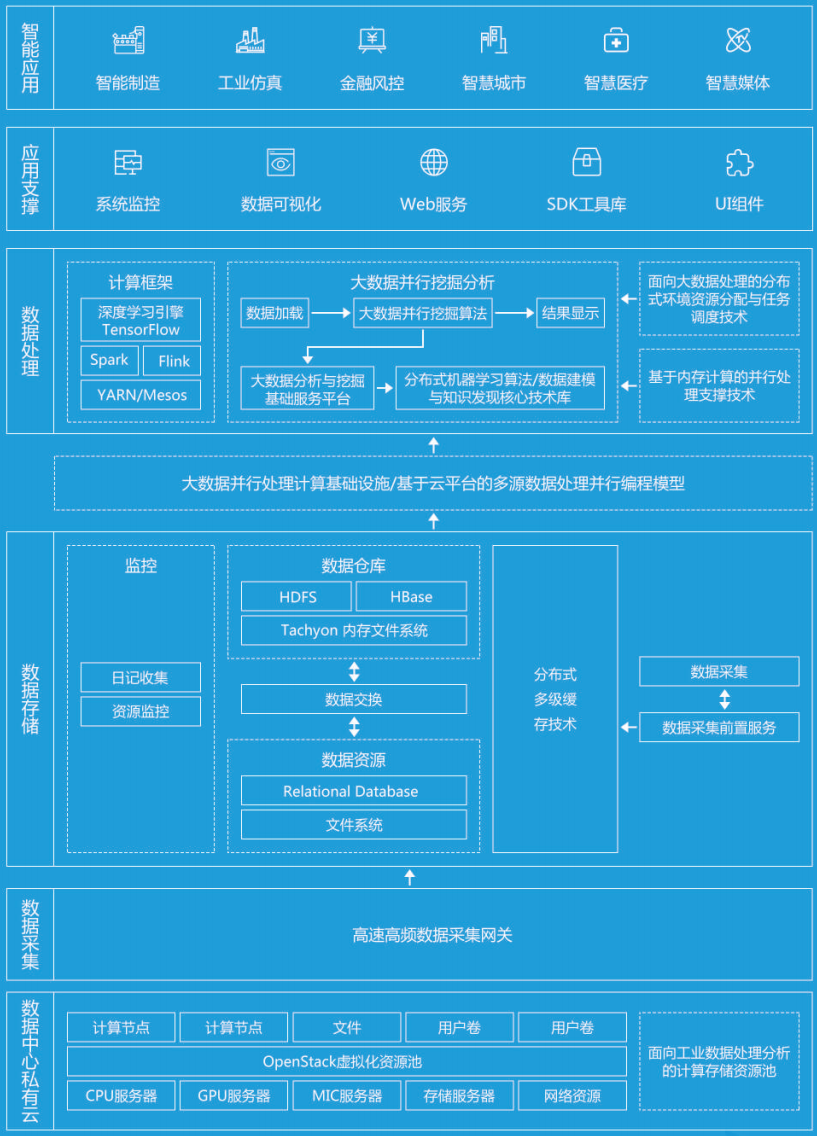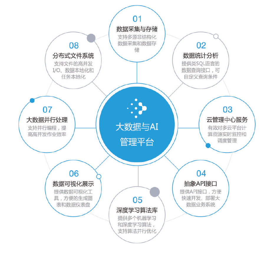 大数据管理平台作为数据并行处理与挖掘服务平台,提供云管理中心服务、大数据存储、数据分析、机器学习算法库和数据可视化展示等一系列服务的数据通用处理平台,拥有高度抽象的编程SDK,能够方便开发人员快速开发部署针对特定业务的大数据处理系统,同时能很好地支撑新业务的新增需求,大大减少开发周期和开发费用。