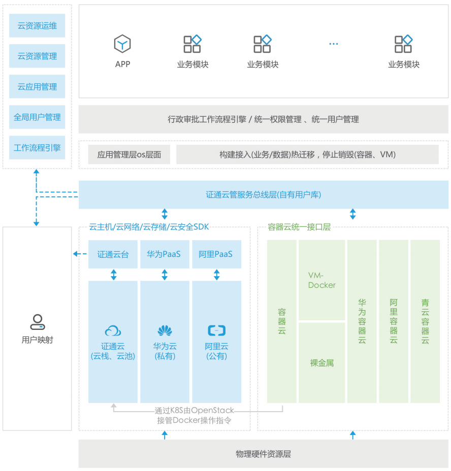 证通多云/混合云平台支持从裸金属服务器开始实现资源池快速构建,集成管理各大云的平台。通过一体化的管理平台对资源池软硬件等资源进行统一地监控、配置、部署和调度,以及进行云服务管理相适应的流程和权限管理等,为企业数据中心的云计算基础架构虚拟化与云业务运营提供解决方案。