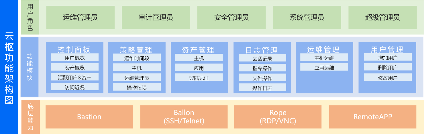 基于数据中心运维安全管理角度出发,通过集中化运维管控、统一运维管理、身份认证与权限控制、运维访问合规性控制、运维过程实时监看、运维过程全程审计、自定义应用发布等功能,为数据中心运维构建一套完善的事前预防、事中监控、事后审计的安全管理体系。
