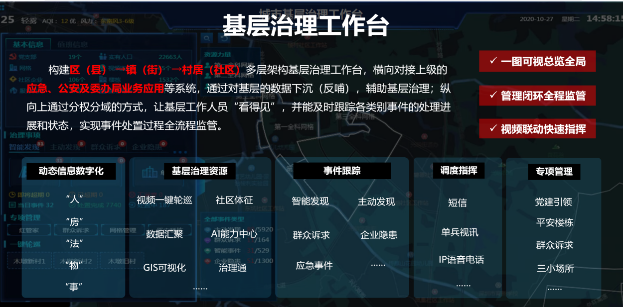 为贯彻习总书记“把更多更好的资源、服务、管理下沉到社区”的基层治理指导方针,充分利用智慧城市已建基础设施,通过整合资源、数据共享为基层治理管理人员、网格员、平安员等提供日常信息化管理工具。聚焦治安、治理、服务三大领域,通过数据下沉、全事件跟踪、资源力量实时调度等手段,用数据把人、制度、服务、管理要求连接起来,真正支撑基层的管理工作,实现精细化治理和精准服务,全面提升社区的治理与服务现代化水平。