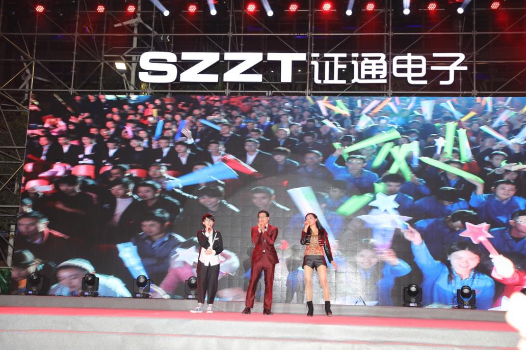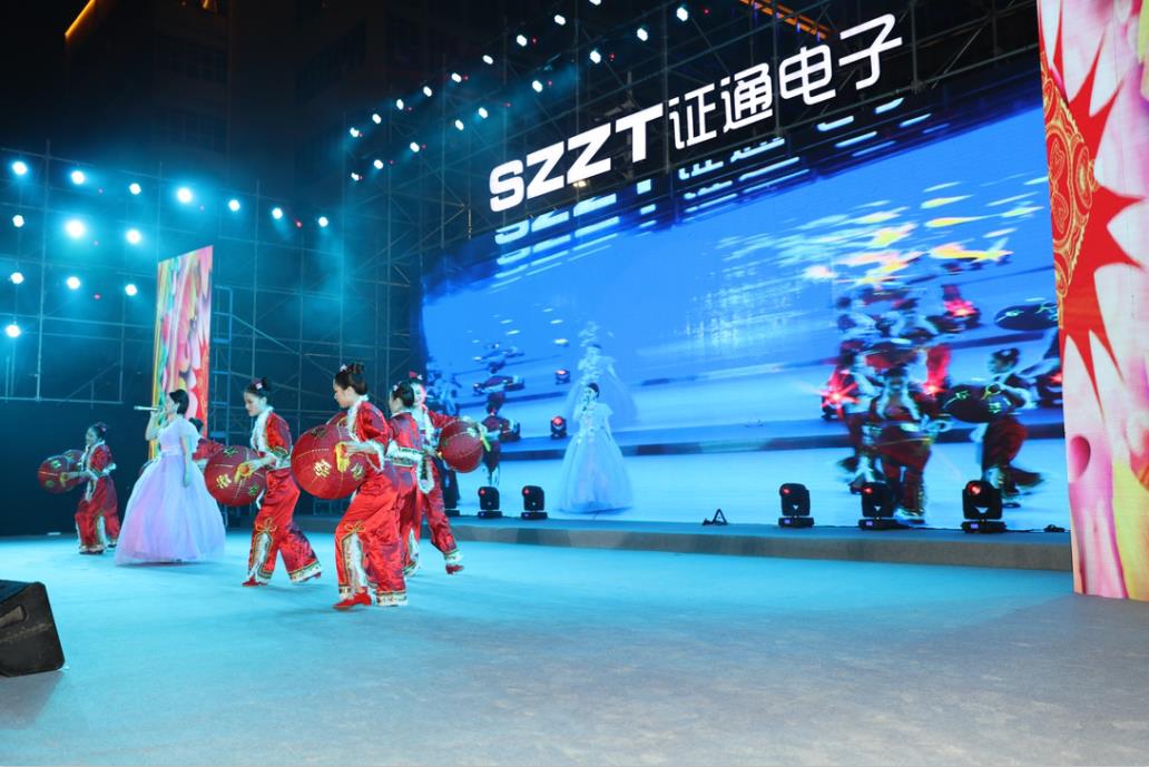 夜幕降临,证通电子产业园人声鼎沸,文艺表演也正式拉开了序幕。晚会通过两台高清摄像机、摇臂摄像机以及航拍机进行LED屏幕的实时呈现和多角度切换。舞台灯光炫目夺人,现场观众挥舞着荧光棒,热浪沸腾。