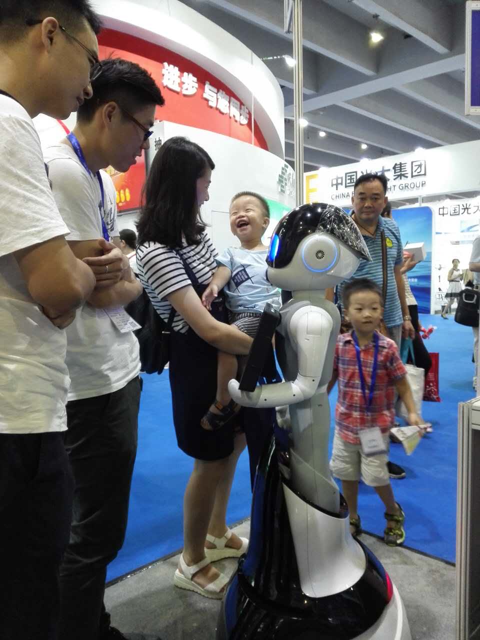 展会现场,不知谁家的小萌娃被FINBOT逗得直乐呵。