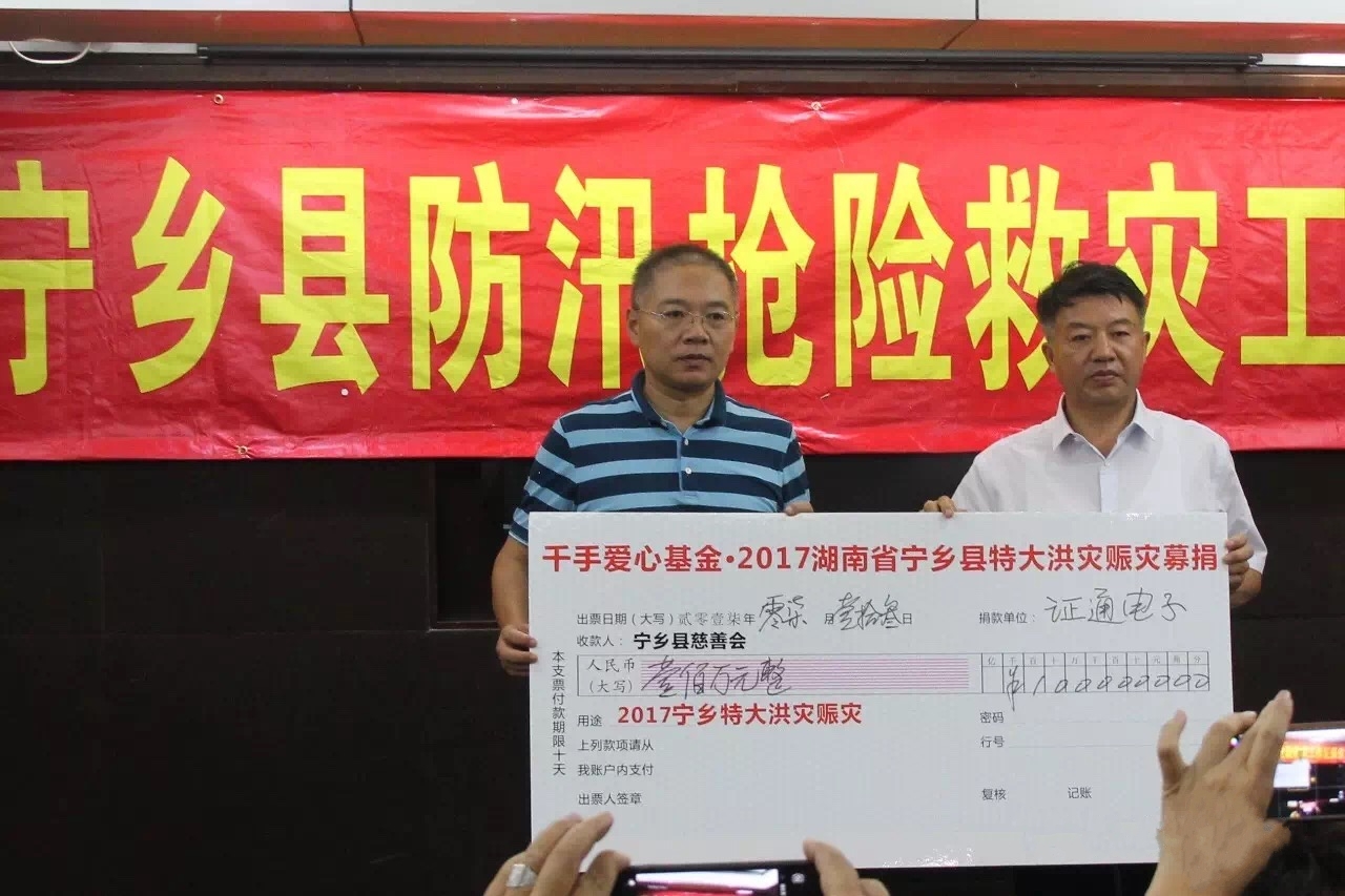 如今,灾后重建成为了各受灾地区的首要任务,作为心系湖南的湘籍企业家,证通电子总裁曾胜强先生时刻关注家乡灾情,洪水的肆虐也牵动着公司员工们的心。洪灾发生后,公司决定通过深圳市长沙商会捐赠抗洪赈灾善款人民币100万元,7月13日,这笔善款正式捐赠给宁乡县慈善会,用于湖南宁乡的灾后重建工作。