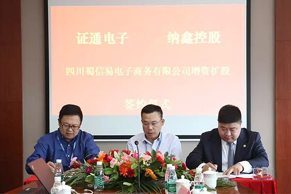 本次合作纳鑫集团将对证通旗下全资子公司——四川蜀信易电子商务有限公司(以下简称“蜀信易”)进行增资扩股,谱写产业与金融相结合的新型合作模式。证通电子总裁曾胜强、纳鑫集团董事长孙明达、蜀信易董事长张锦鸿等出席了此次签约仪式。