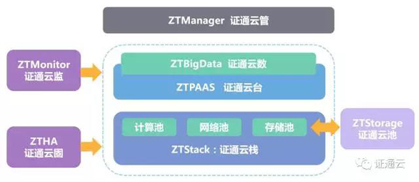 证通云产品按功能组件可划分为IAAS基础设施、PAAS基础设施、云存储组件、高可用异动容灾组件、云监控组件、PAAS大数据平台组件、云管理平台七大部分,分别是: