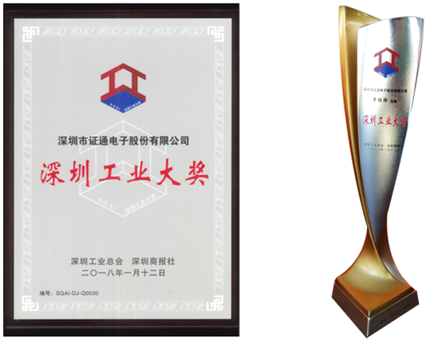 2018年1月12日,深圳工业创新成果发布会暨深圳工业总会 2017 年度年会在五洲宾馆隆重举行。在会上对第三届“深圳工业大奖”、2017年度“履行社会责任杰出企业”、2017年度“深圳百优工匠”企业进行了表彰,证通电子斩获“深圳工业大奖”企业奖和企业家奖双料大奖。