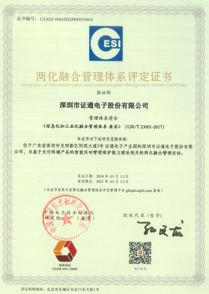 证通电子作为深圳市两化融合试点企业,2017年顺利通过中国电子技术标准化研究院两化融合管理体系评估审核组共两个阶段的的评审,于今年获得两化融合体系认证证书。