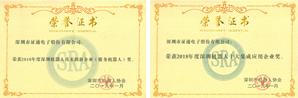1月14日,2019深圳机器人创新与发展论坛暨2018深圳机器人年度评选颁奖典礼盛大开幕,证通凭借多年的行业深耕、技术积淀、产品创新,在众多竞争者中脱颖而出,荣获了2018机器人“技术创新企业”和“十大集成应用”两项大奖,成为2018年度唯一一个同时获得技术创新与应用集成的服务机器人企业。