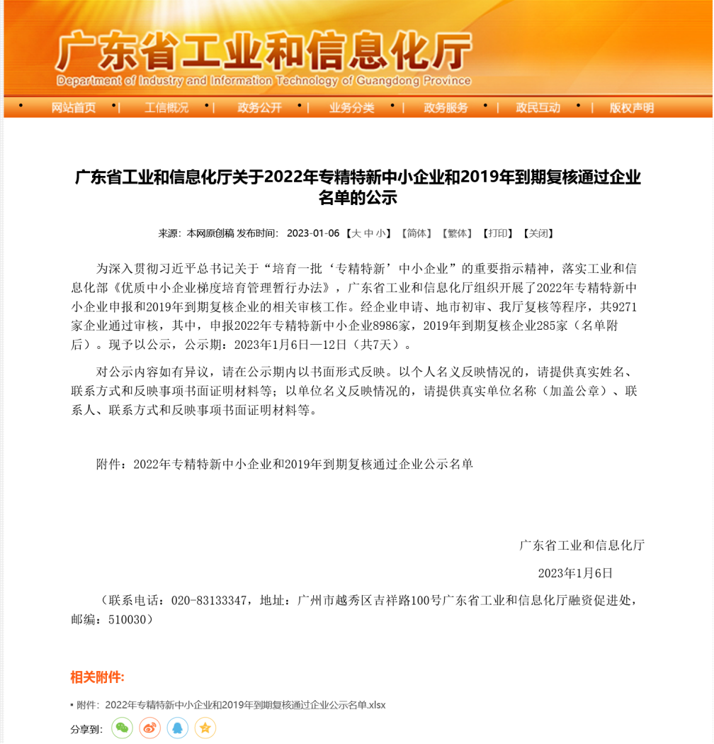 http://gdii.gd.gov.cn/zwgk/tzgg1011/content/post_4077221.html广东省工业和信息化厅关于2022年专精特新中小企业和2019年到期复核通过企业名单的公示。