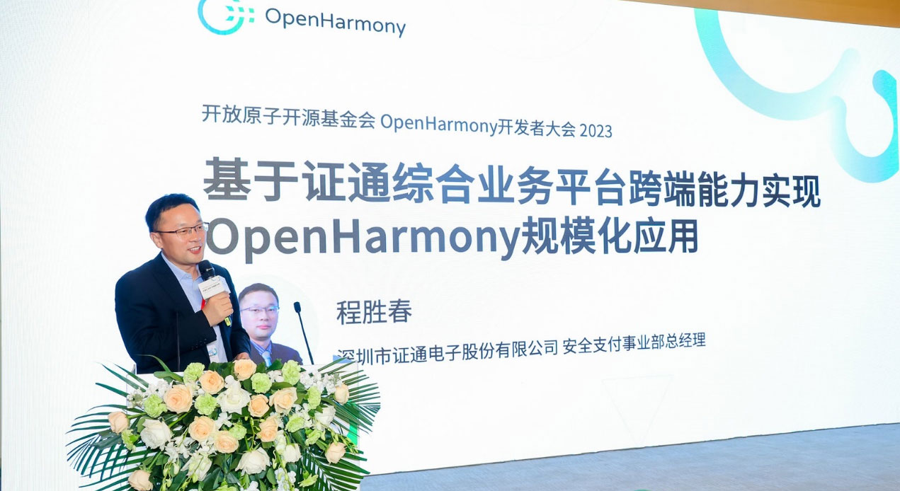 作为本次大会的演讲嘉宾,证通电子董事、安全支付事业部总经理程胜春先生受邀出席参与主论坛、商业生态分论坛,并于分论坛上发表了《基于证通综合业务平台跨端能力实现OpenHarmony规模化应用》的重要演讲,让与会嘉宾感受到了OpenHarmony金融服务网点场景化的发展,以及金融行业OpenHarmony商业化的巨大潜力,鉴于证通电子生态实践成果,获得OpenHarmony生态实践示范单位称号。